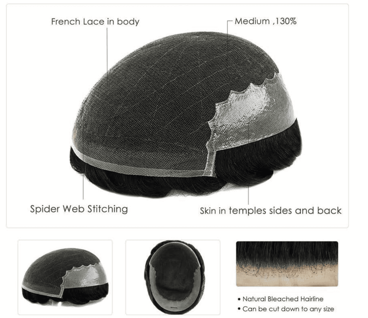 Base Design: French Lace in body, 1 1/4″ – 2″ Skin in sides & back