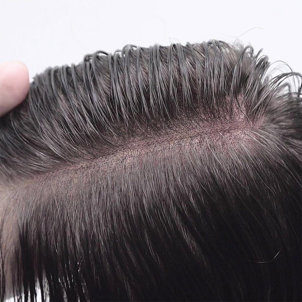 100% human hair is used for the hybrid hair replacement system. Most of the hair is tied to the base in double-split knots and will never come off.